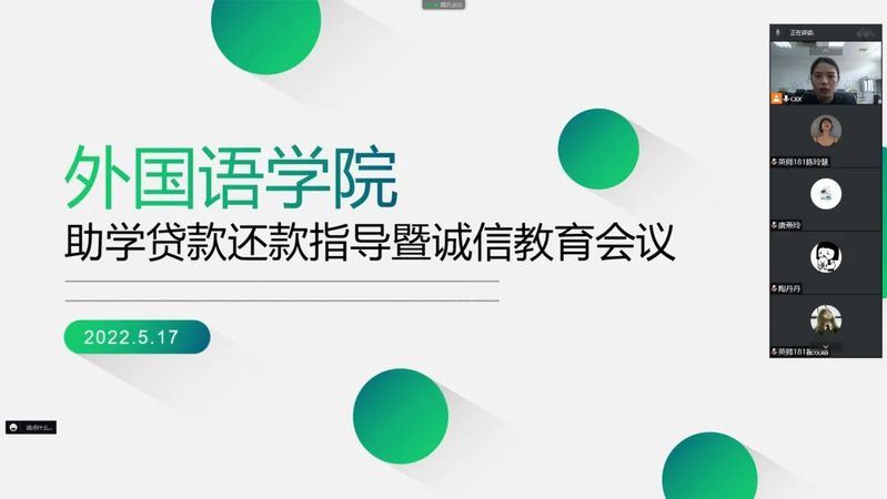 5月17日,金沙集团186cc成色召开助学贷款还款指导暨诚信教育线上会议,学院党委副书记、副院长陈俊怀,学工办主任王媛媛出席会议,学院对接学生资助工作辅导员陈习主持会议,2022届全体贷款毕业生参会。