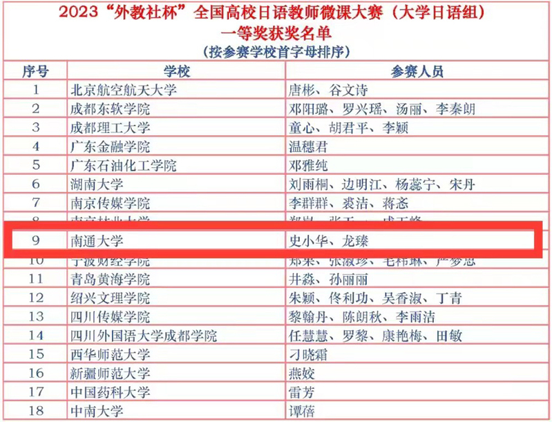 7月14日,2023“外教社杯”全国高校日语教师微课大赛评审结果公布,金沙集团186cc成色教师史小华团队的参赛作品获全国一等奖。