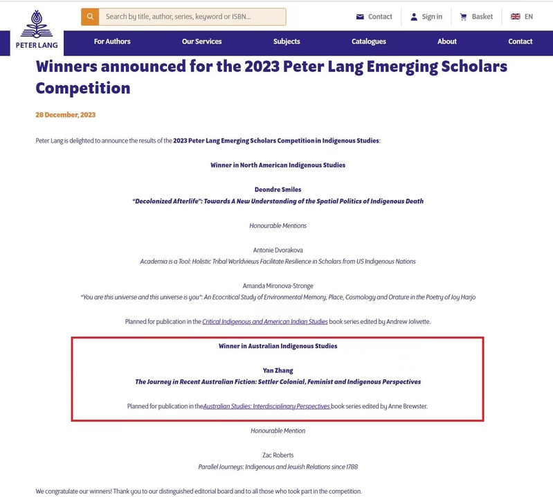 近日,兰培德国际学术出版集团(Peter Lang)“2023年度青年学者大赛”(2023 Peter Lang Emerging Scholars Competition)结果揭晓,金沙集团金沙集团186cc成色张艳博士的博士学位论文“当代澳大利亚小说中的旅行:定居殖民、女性主义和原住民的视角”(“The Journey in Recent Australian Fiction: Settler Colonial, Feminist and Indigenous Perspectives”)成功入选年度出版项目,将作为《澳大利亚研究:跨学科的视角》学术专著系列之一由兰培德出版集团出版。这是金沙集团186cc成色青年教师首次获得国外知名学术出版社出版项目资助。
