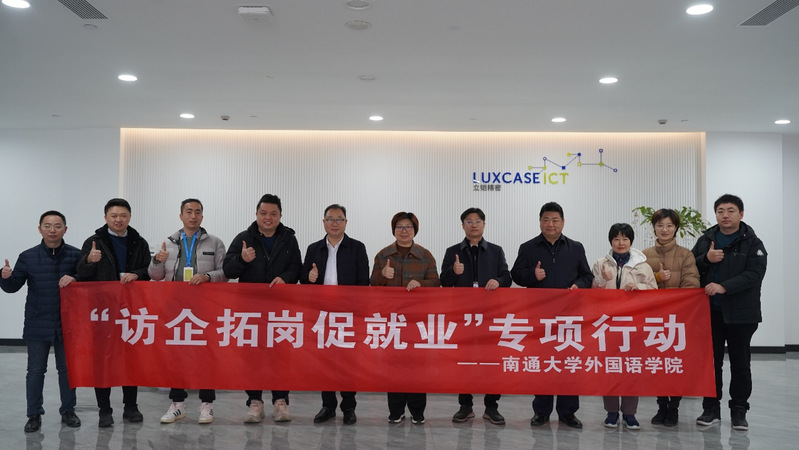 为进一步拓宽毕业生就业渠道,提升毕业生就业质量,2024年12月12日,学院党委书记朱小娟、副书记(副院长)陈俊怀、翻译系主任曹雁华、学工办主任王媛媛、学工办副主任陈孔飞赴立铠精密–日达智造科技(如皋)有限公司开展访企拓岗促就业专项行动。如皋人社局副局长周昌峰、日达智造高级总监汪东平、NIP总监柯正洋等企事业单位领导参加校企交流会。